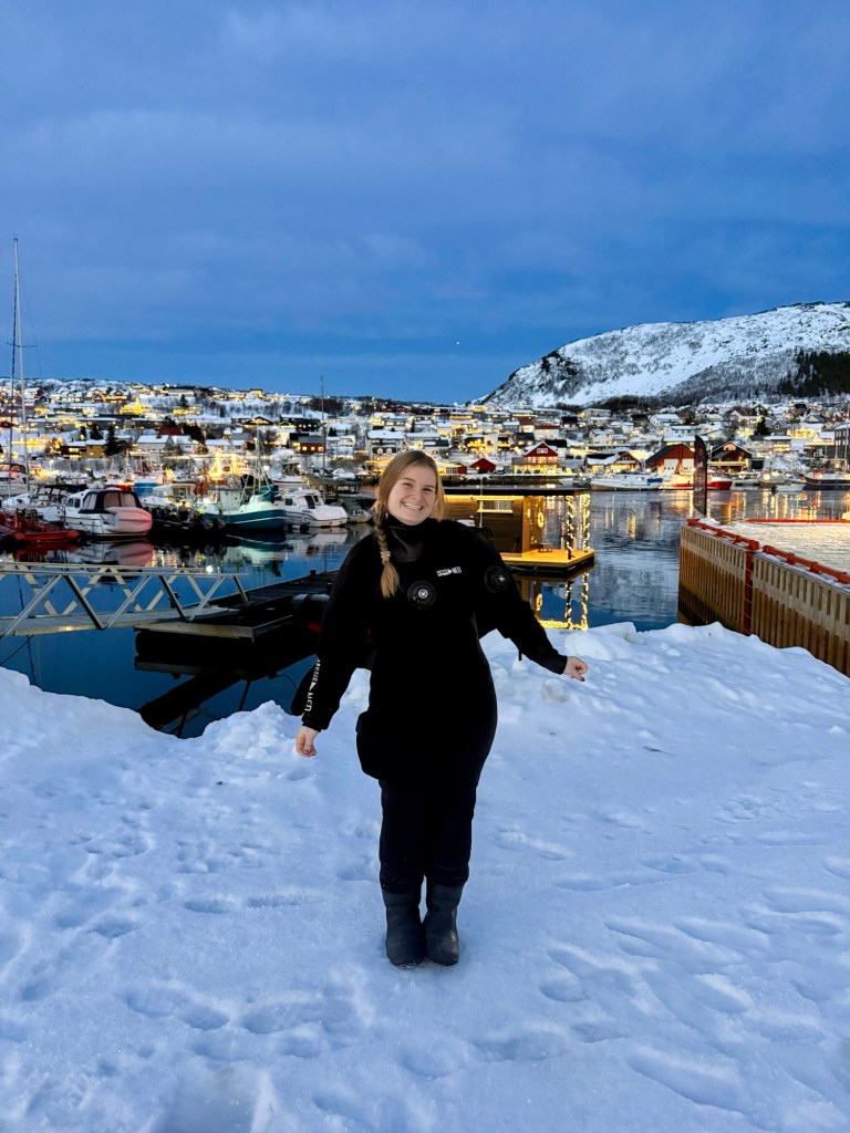 We booked our swim with orcas tour with Lofoten Opplevelser and it cost £272 per person. The day starts at 9am, meeting at their base for a full briefing before getting kitted up. Don’t worry about the cold – you’re given a dry suit, along with thermal underlayers, socks, gloves and a hood. The only things you need to bring are your own thermals and of course your camera. I also brought my own snorkel and mask.