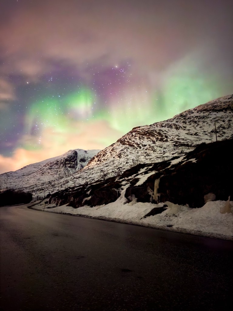 We waited in the car until that glow appeared in the sky – then ran outside to start taking photos. The colours were incredible – bright greens and pink dancing above us. The scenery made it even better, with dramatic mountains framing the lights. We stayed out for several hours watching them and didn’t return to Tromsø until 2am as the northern lights continued to glow and move across the sky.